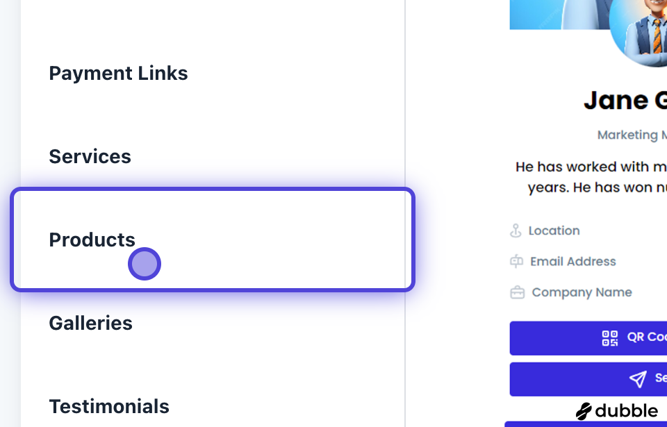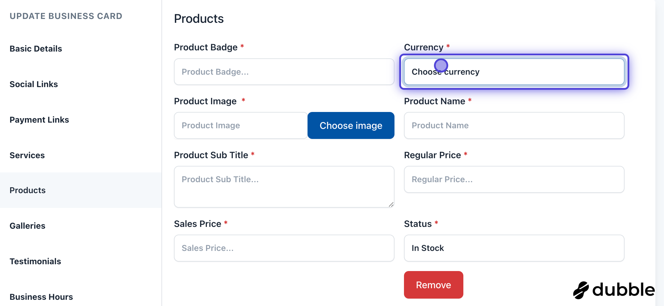 Fill the form to add the product to your card. You must add a product badge, select a currency, add an image, product name, description, and price.